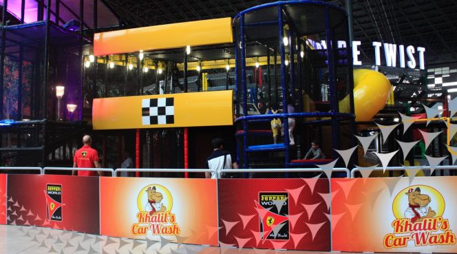 A racecar themed play area for toddlers, where kids can have all sorts of fun playing around with pedal racecars, climbing the grandstand, and sliding down Khalil’s Car Wash!