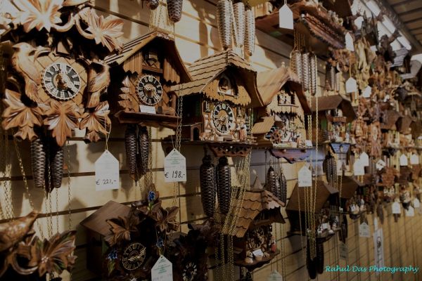 The Cuckoo clock – The region is famous for its cuckoo clocks. What is a cuckoo clock? – It’s a pendulum regulated clock that strikes the hours with a sound like a common cuckoo’s call and has an automated cuckoo bird that moves with each note. The design of the clock is conventional – most are made in the ” traditional style ” also known as ‘carvea’ or ‘ chalet’ to hang on a wall. There are two kinds of movements: one day and eight-day clock works. Some have musical devices and play a tune on a Swiss music box after striking hours and half hours. When the bells rhyme together the symphony it makes calls for wonderful music.