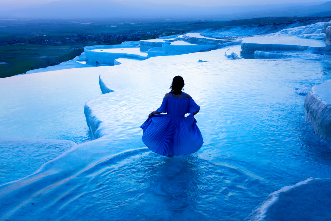 The best way to experience the uncrowded Pamukkale pools is to spend the night in Pamukkale village and arrive early at the pools. The tourists do not arrive until later in the day and you can enjoy the quite time here.